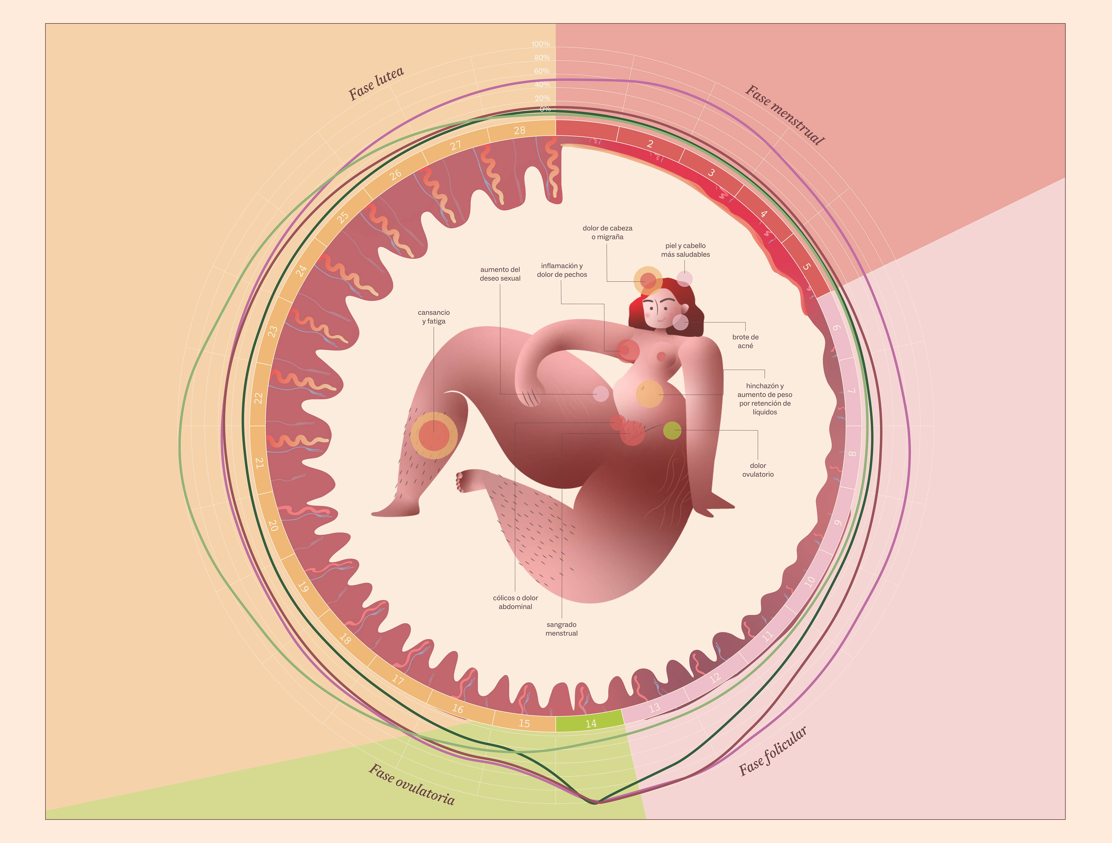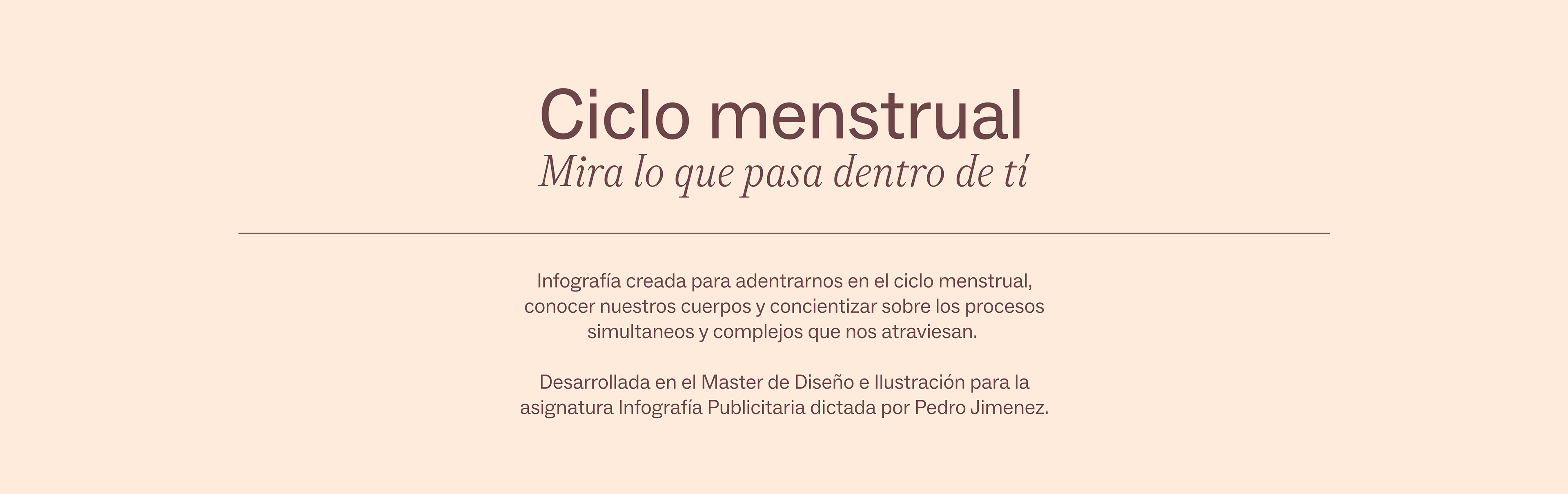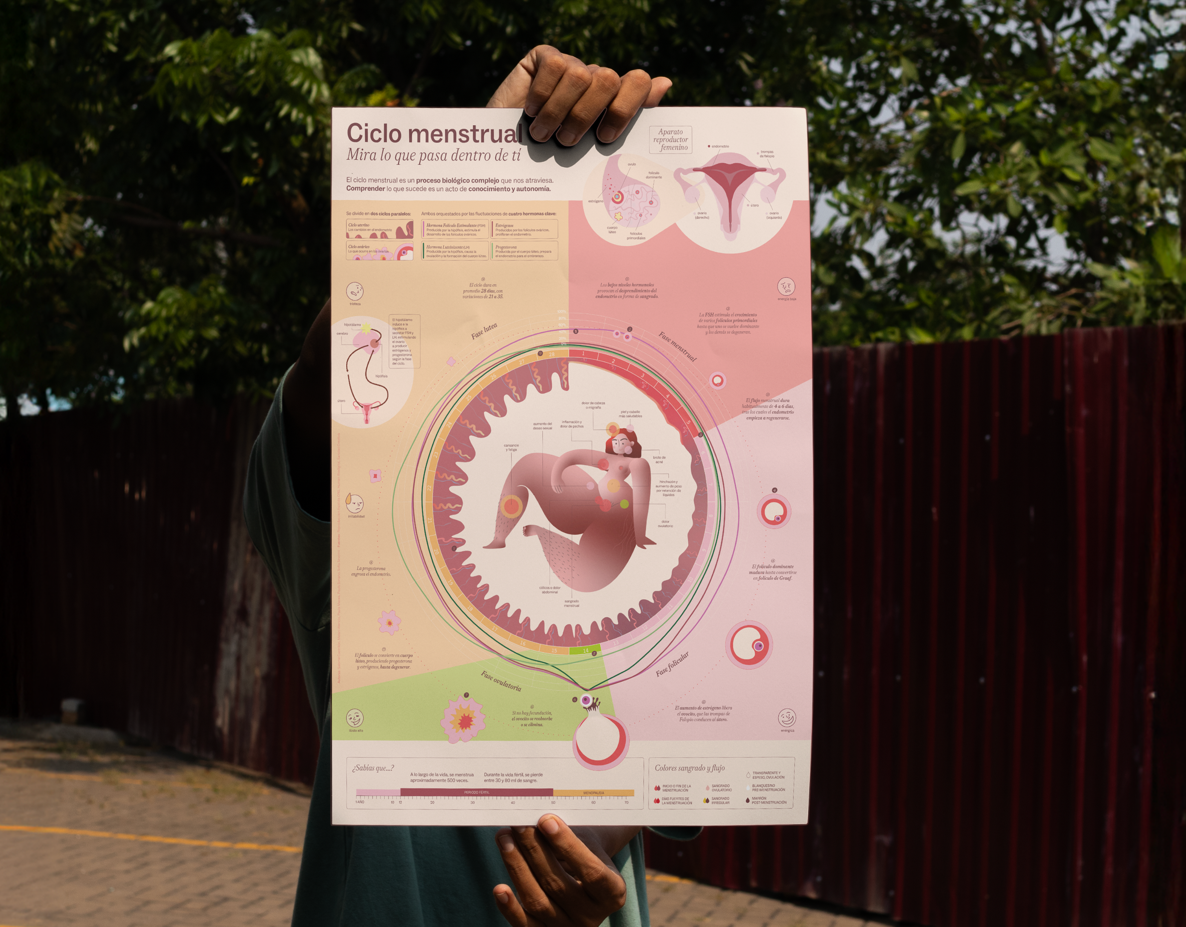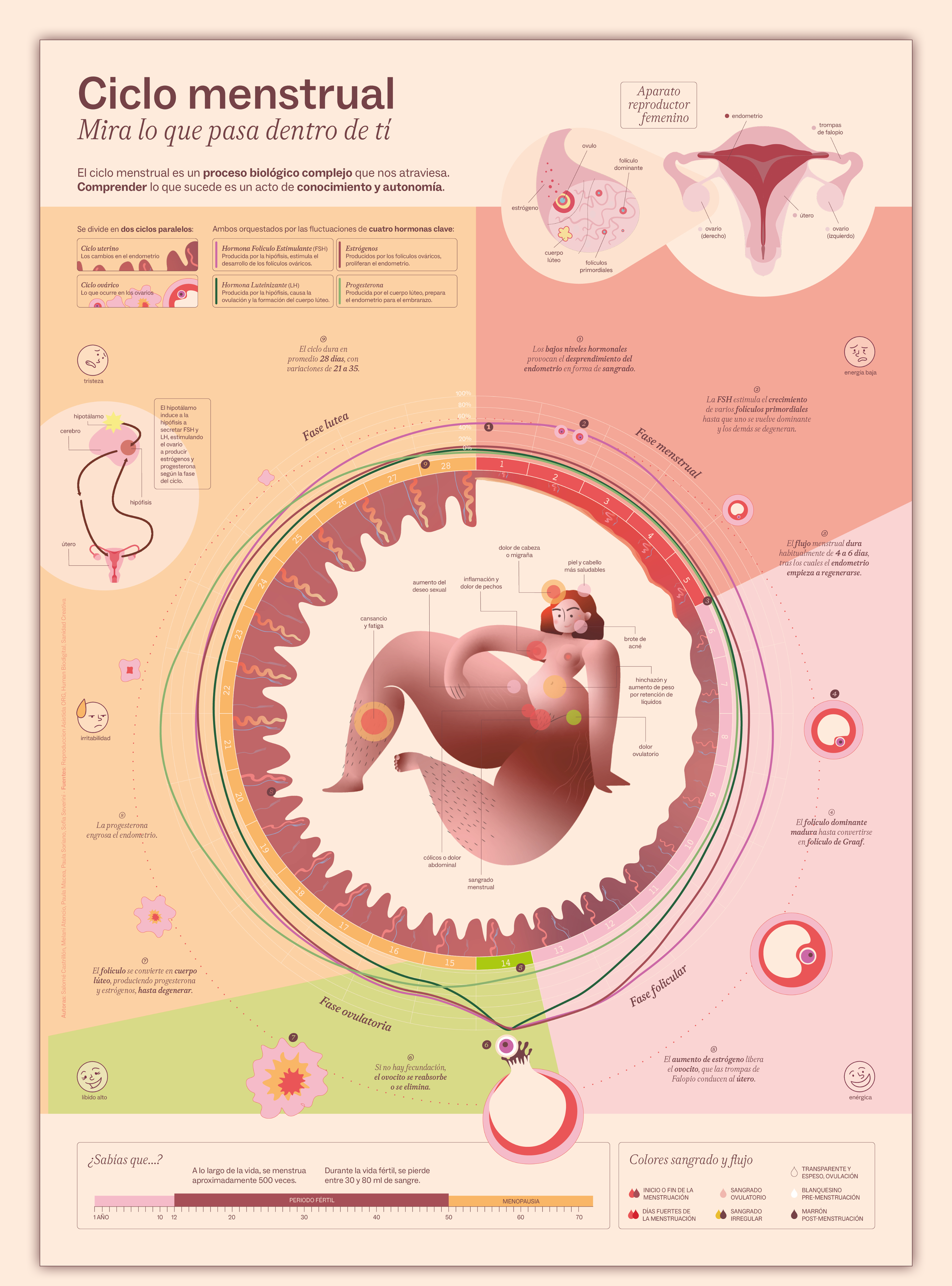 La infografía aborda el ciclo menstrual como un proceso biológico complejo y continuo, alejándolo de miradas simplificadas. A través de la visualización, el proyecto busca el conocimiento del cuerpo como una forma de autonomía.