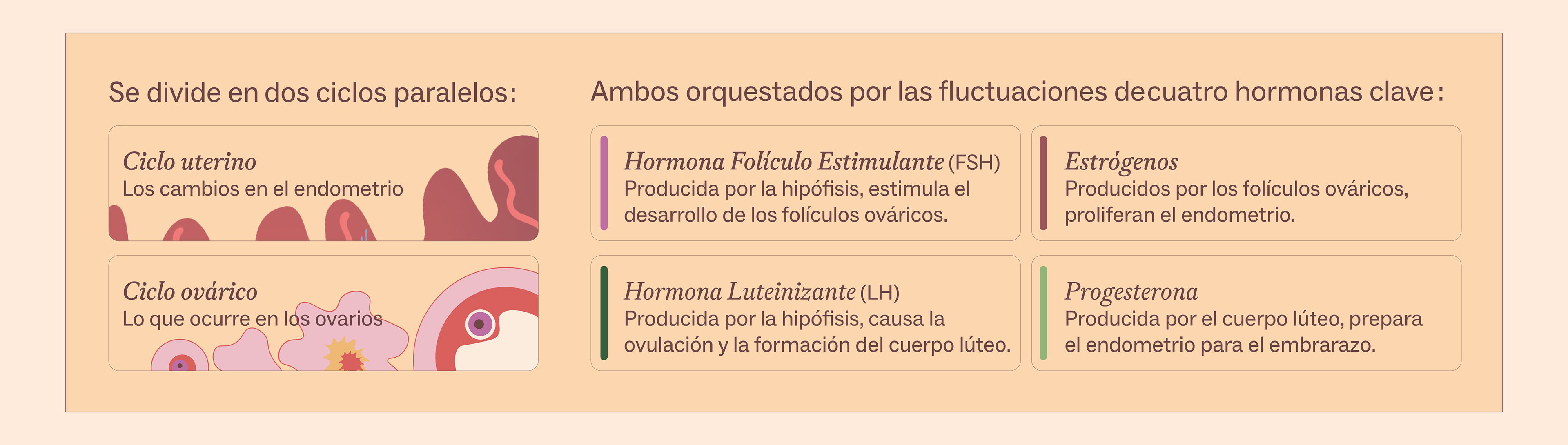 El ciclo menstrual se presenta como la interacción de dos procesos paralelos y cuatro hormonas clave.